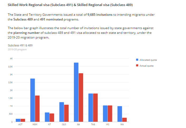 对于489/491偏远地区担保,2019-2020财年各州一共发放了9685个配额。