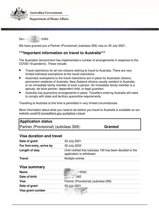 直到2020年11月,Z女士经人介绍找到我们咨询,我们建议Z女士先递交309签证,这样在等待入境的同时,澳洲移民局也可以开始审理自己的309签证申请。Z女士最终听从了我们的建议,在这里非常感谢Z女士的信任和积极配合。