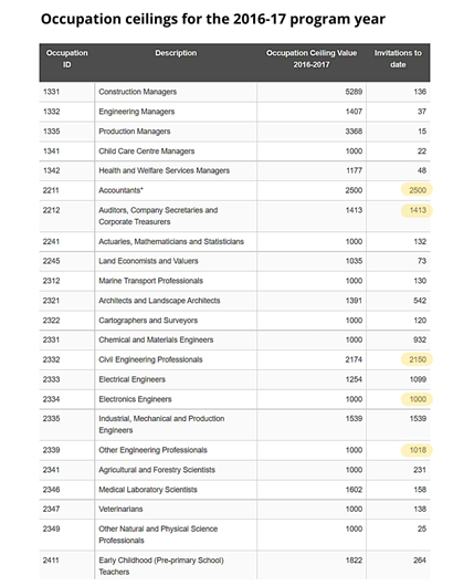 我们可以跟之前2016-2017财年的邀请数据进行对比,其实移民局在正常情况下邀请的数据和整体的名额是匹配的。特别是会计工程等热门专业,都是全部用完配额。