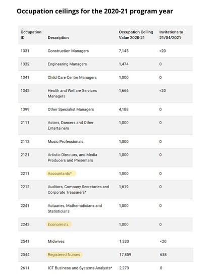 其中比较明显的配额的分部差距是移民局预留了1000个配额给会计类的和经济学家,但是显示获邀人数为0。护士共有17859个配额但是只邀请了658个。