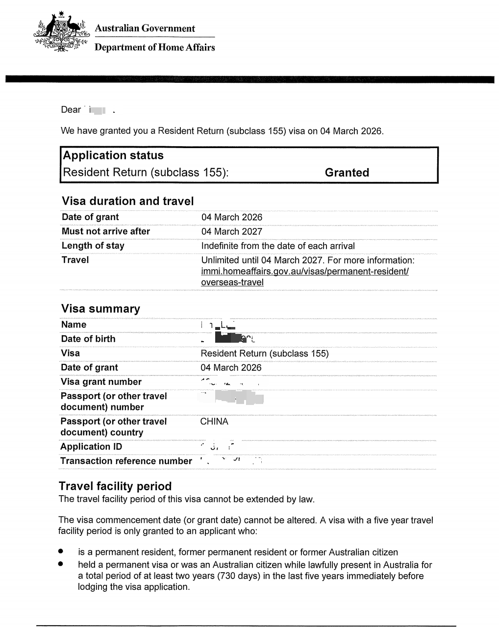 在完成签证递交后,经过1个月的等待,L女士无补料成功获得155居民返程签,为重返澳洲开启了大门。