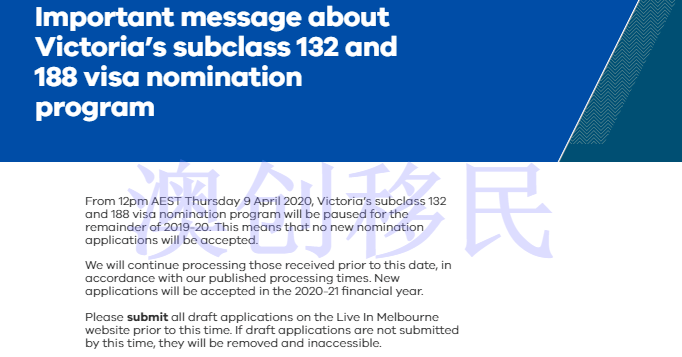 维多利亚州4月8日宣布 2019-2020财年投资移民申请人的配额已经用光。2020年4月9日起不再获批新财年的州政府担保,在这之前递交的申请人仍然会继续审理。