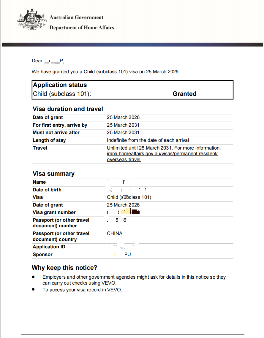 恭喜P小朋友获批澳洲101签证